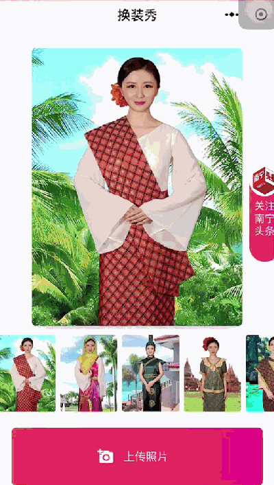 进入“东盟服饰秀”小程序后,选择一套你满意的服装,自拍(拍别人)或者选择现有照片上传合成(PS:面部光线要清晰哟!)即可一键生成身穿东南亚美美服饰的你哟!(主要的是要分享给朋友~)