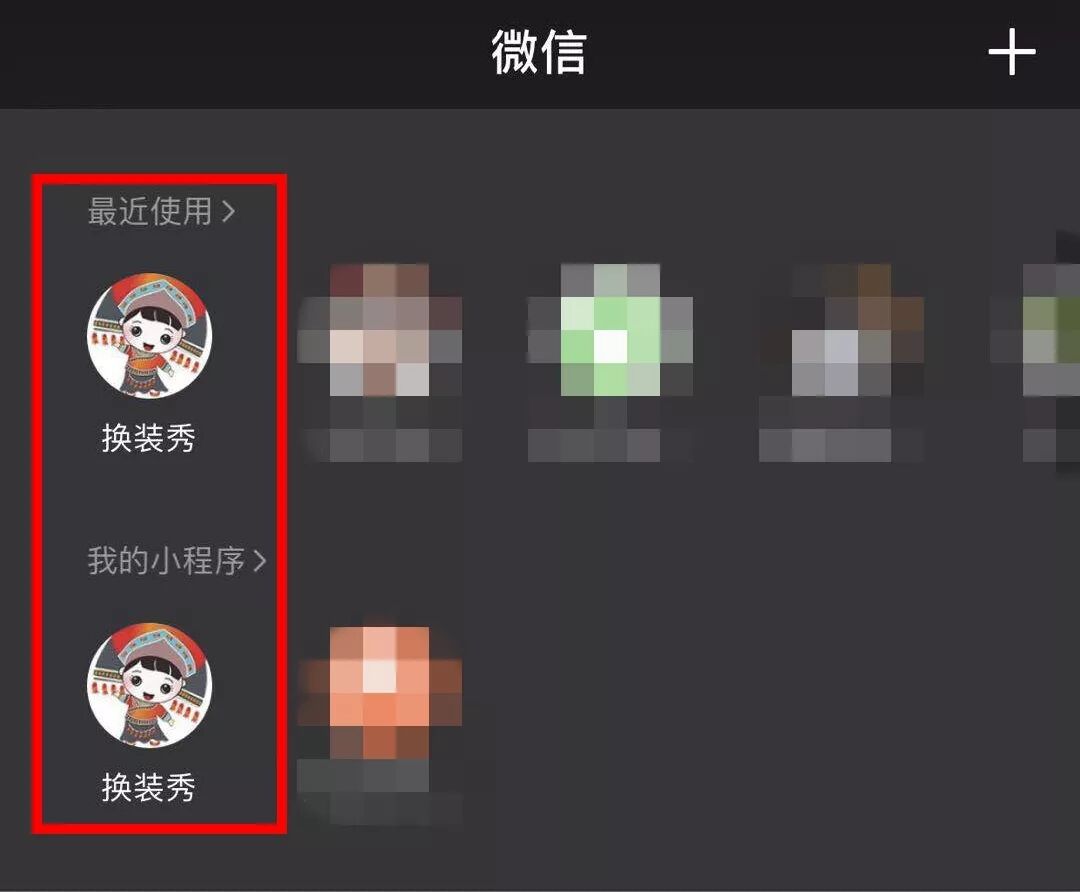 删除小程序后再次登录。删除方法为:“微信”→“发现”→“小程序”→长按“壮族服饰秀”,删除。