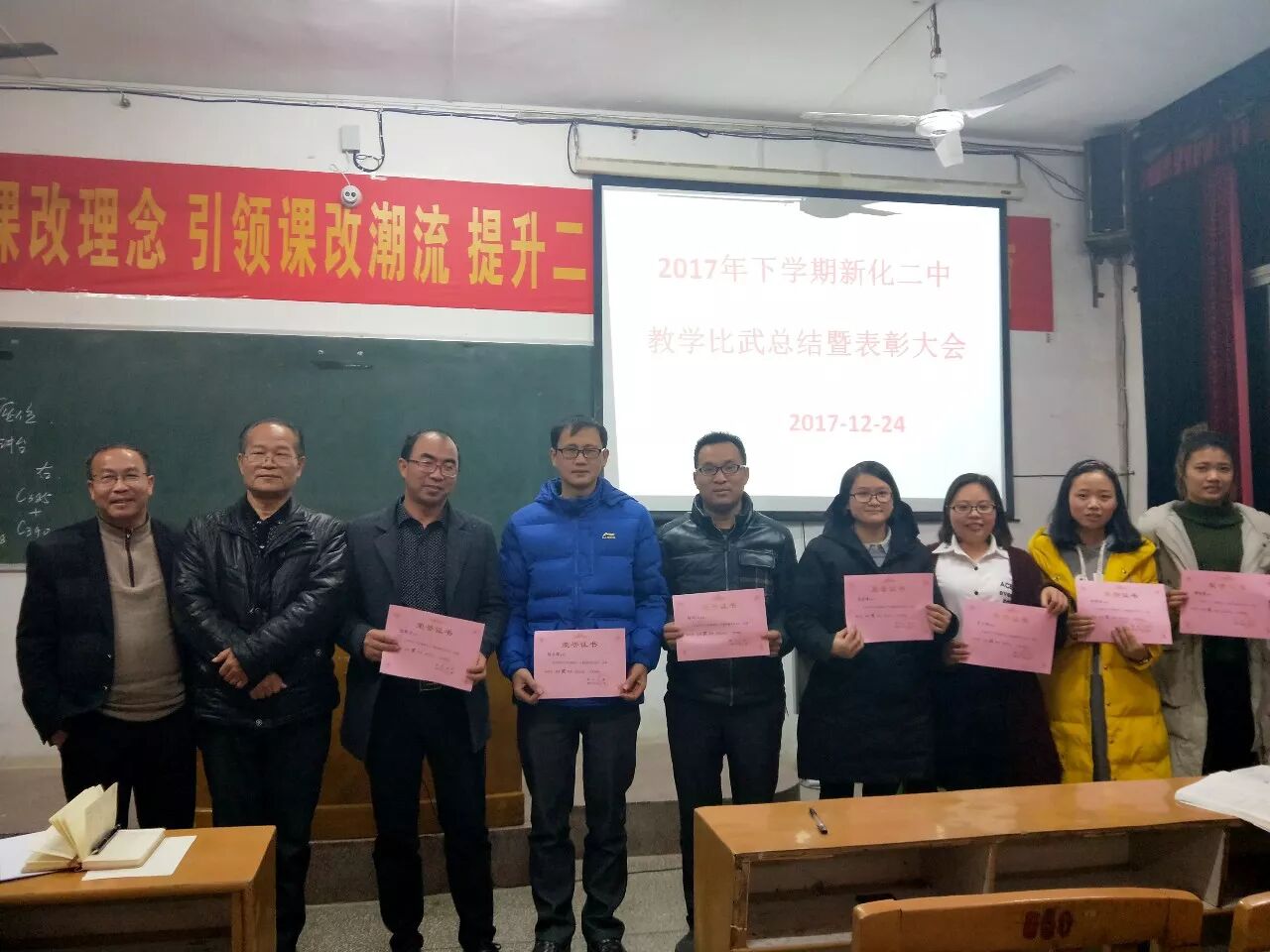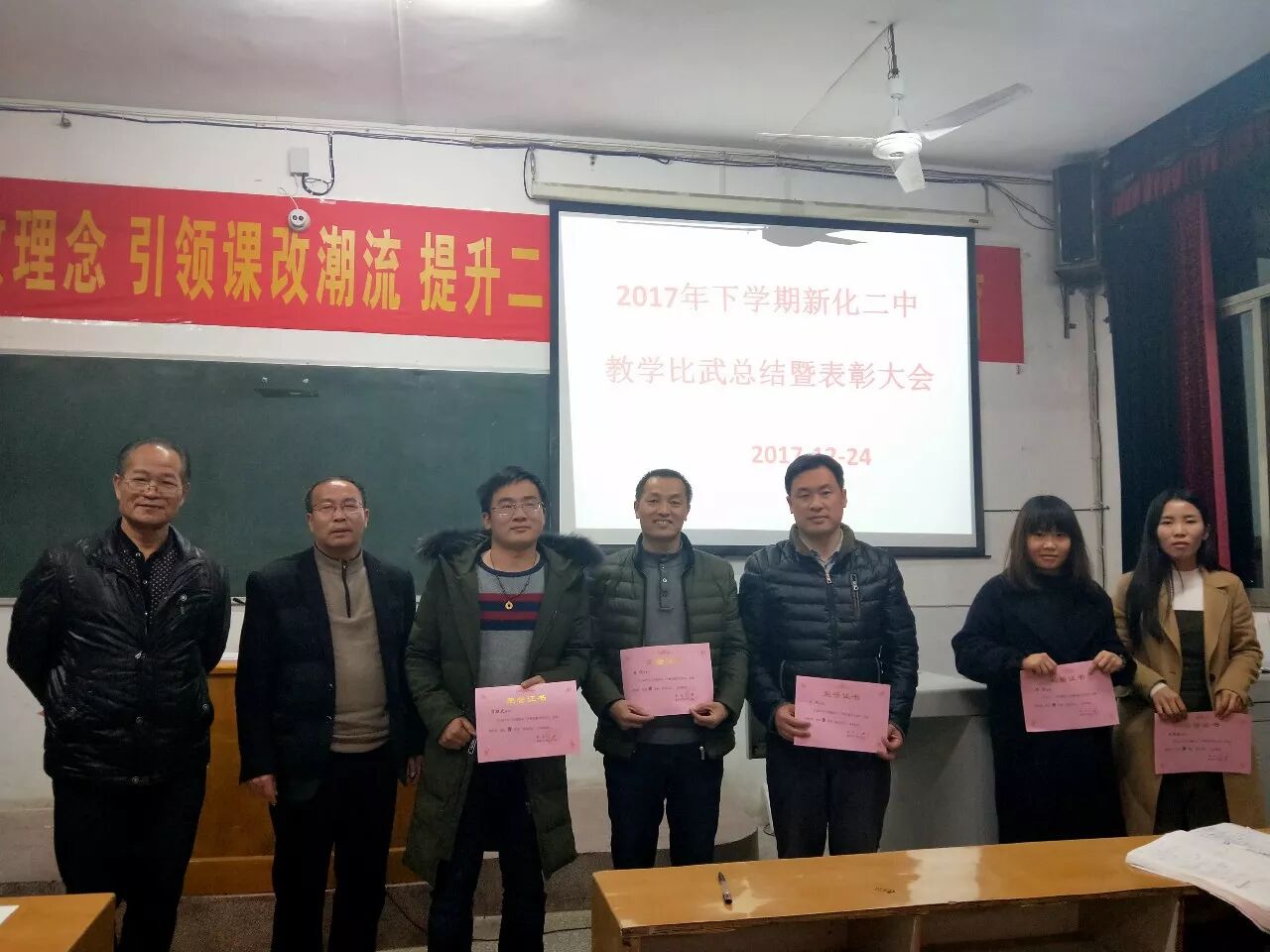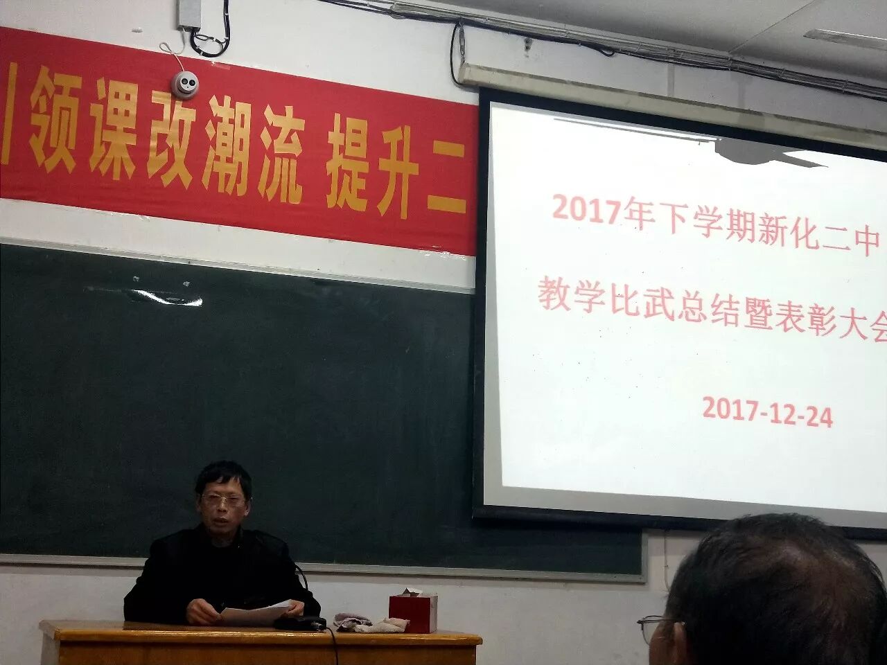 2017年12月24日,新化二中一年一度的教学比武落下帷幕,龙清会、曾锦文等六位老师获得一等奖,何晴亲、杨永辉等八位老师获得二等奖,杨应军、伍朵娟等十位老师获得三等奖。晚上,在全校教工大会上,李合高校长宣布获奖名单,陈友才支书颁发证书。