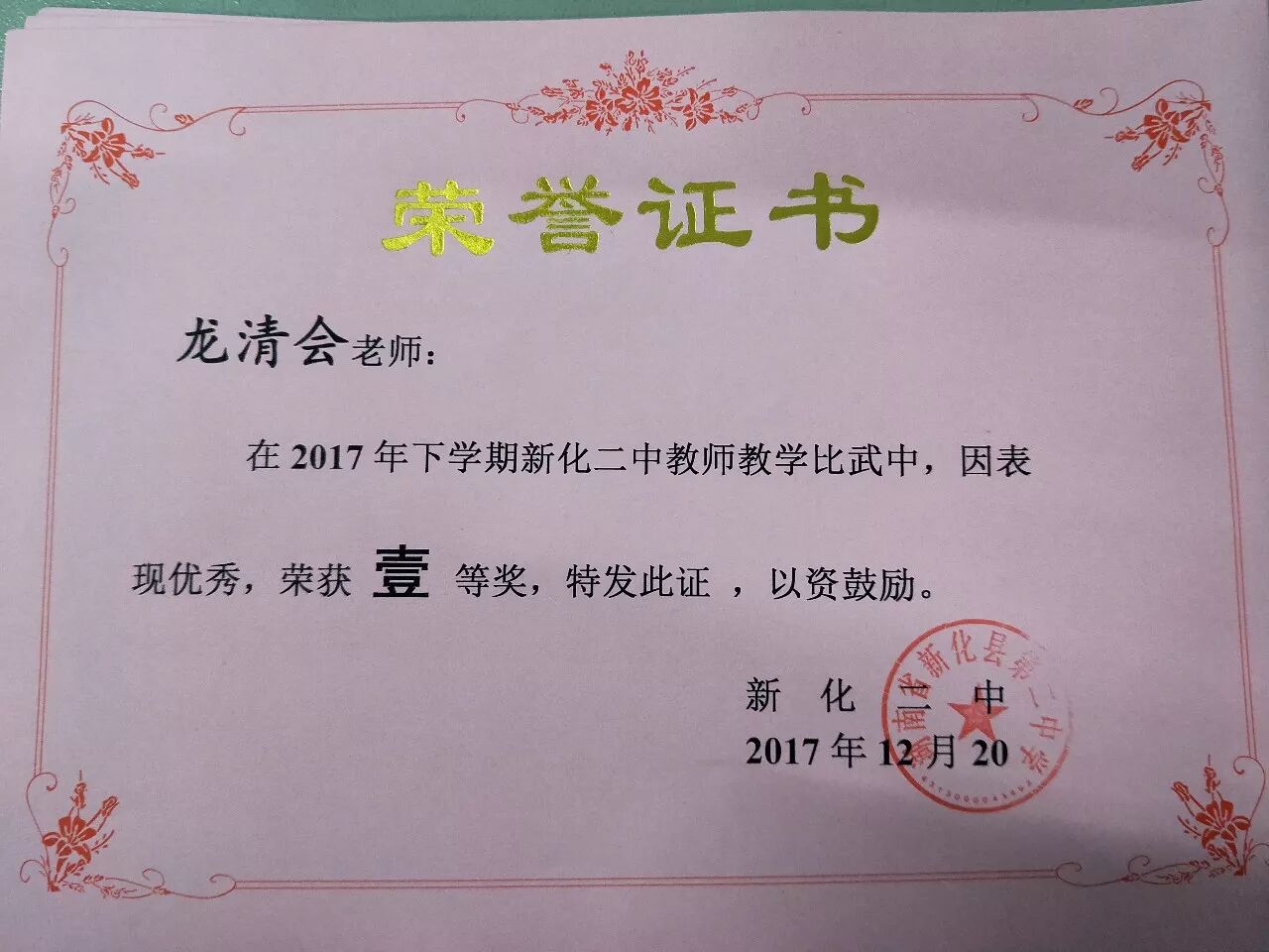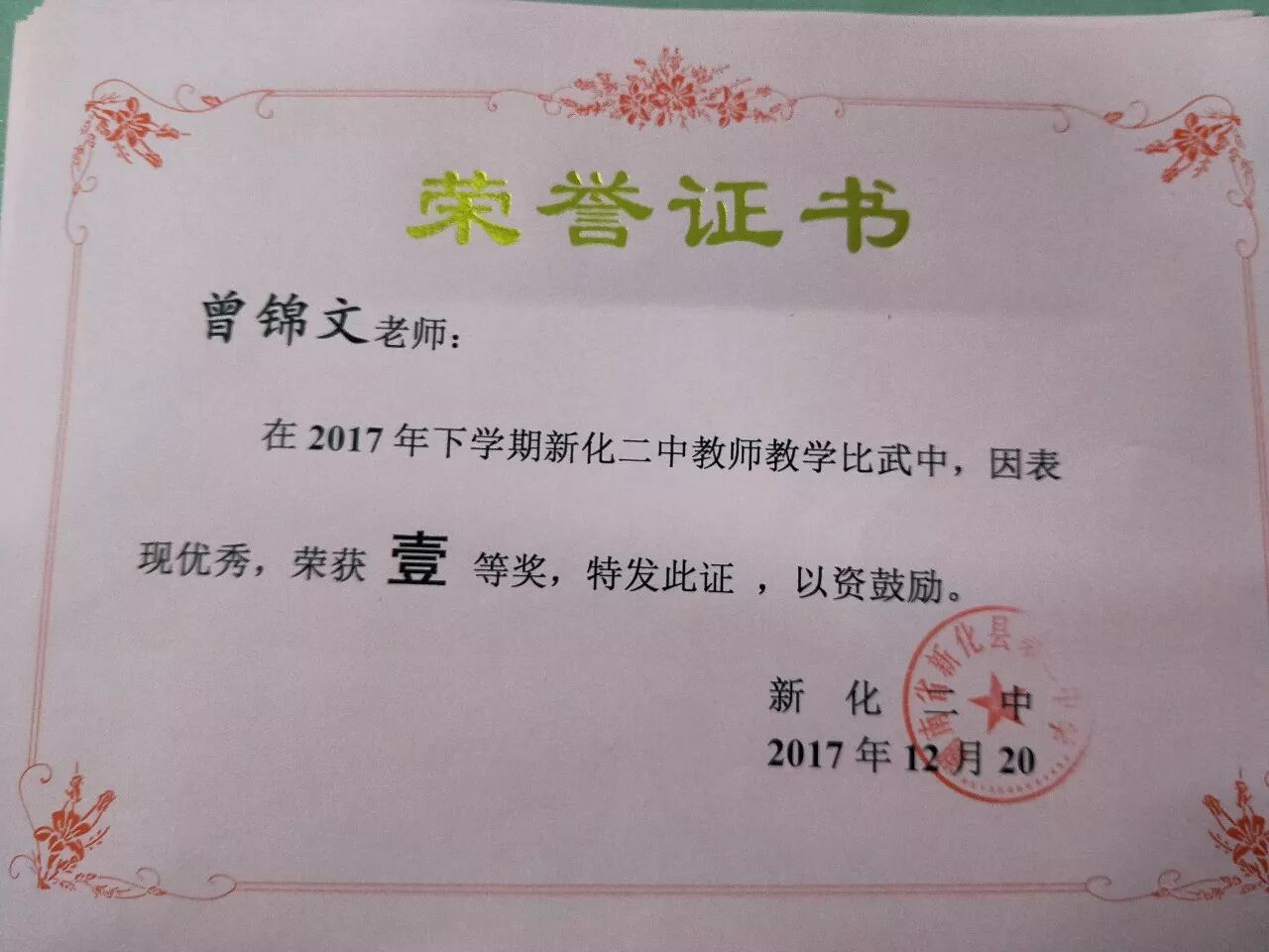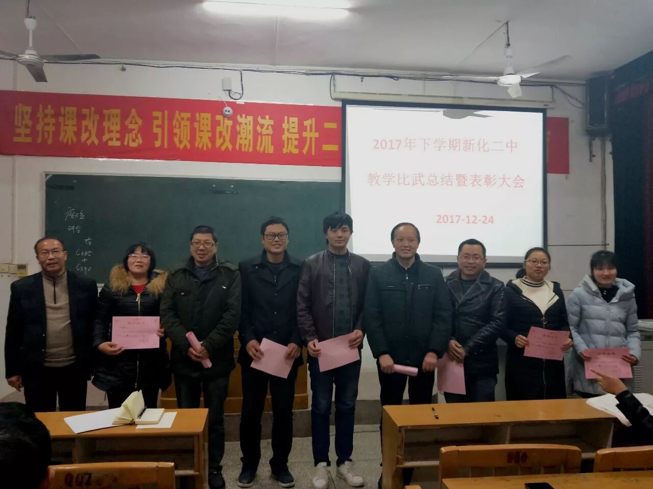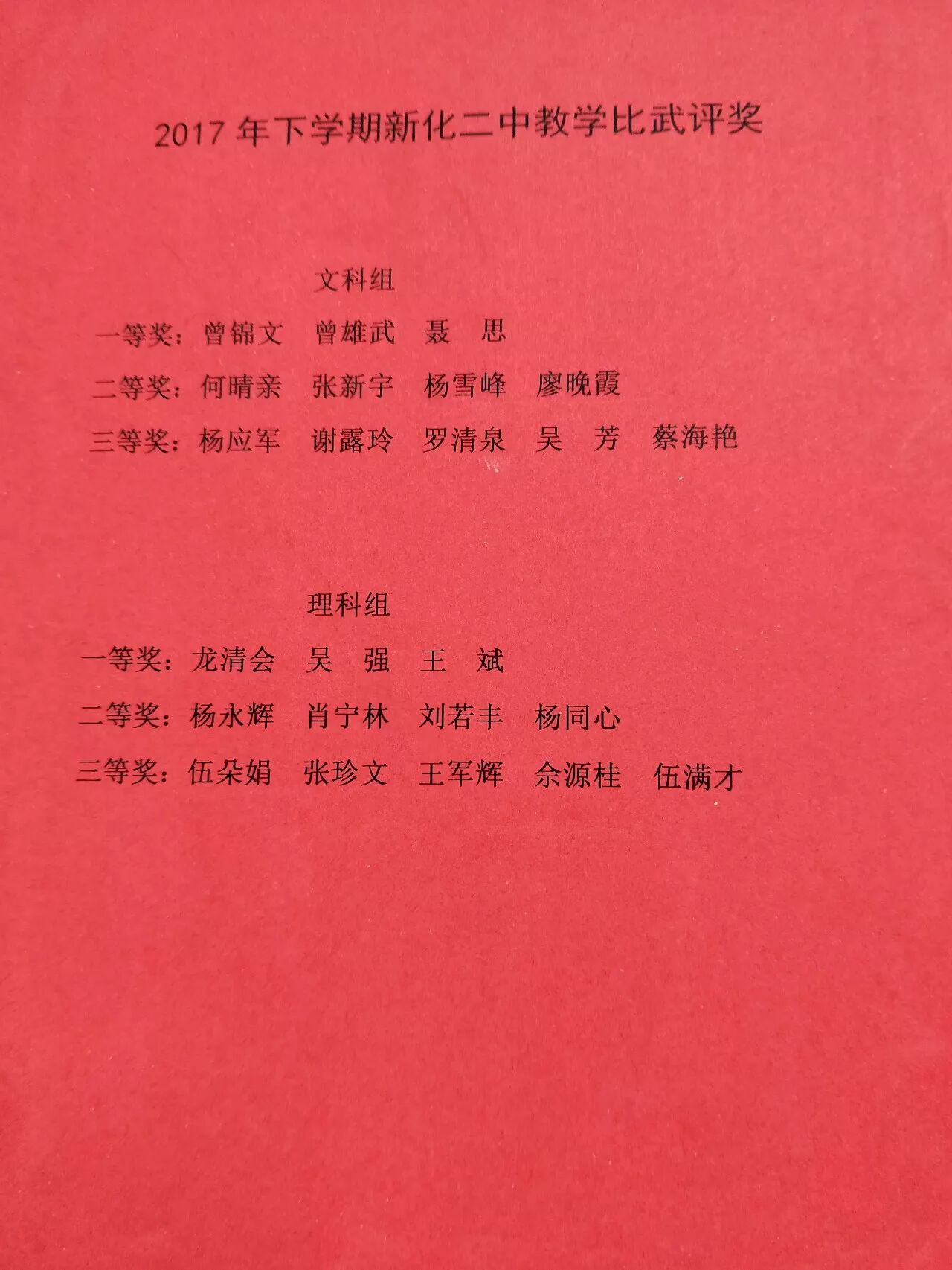 2017年12月24日,新化二中一年一度的教学比武落下帷幕,龙清会、曾锦文等六位老师获得一等奖,何晴亲、杨永辉等八位老师获得二等奖,杨应军、伍朵娟等十位老师获得三等奖。晚上,在全校教工大会上,李合高校长宣布获奖名单,陈友才支书颁发证书。