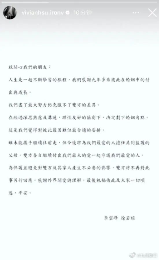 12月10日,艺人徐若瑄在社交媒体上宣布,和富商丈夫李云峰离婚,结束9年婚姻。徐若瑄发文如下: