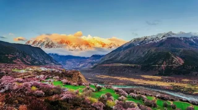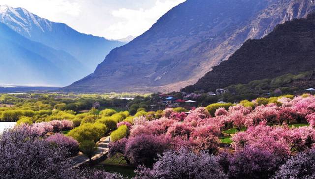 每年的二月、三月,当连绵起伏的群山还披着厚厚的白色雪衣,林芝漫山遍野的桃花开始铺满山坡,绵延至河谷,在雪山冰川的映衬之下怒放着野性的壮美。