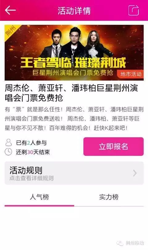 大家进入无线荆州,点击首页幻灯《周周抢杰伦》,进入官方报名通道报名抢票。