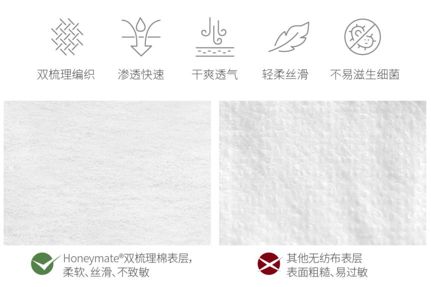 美则Honeymate的另一大优势,就是薄薄的一片,超干爽的三层吸收体,六倍吸收速度,且薄度只有不可思议的0.1cm。你完全感受不到它的存在。