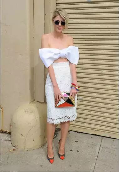 换装劳模Sofie Valkiers的造型总会给我们别样新意,夸张色彩的手包、手链点亮了这身素雅的纯白look,同样引人注目的还有那超大蝴蝶结状抹胸,全世界敢穿的博主也没有几位能hold住这范儿吧~
