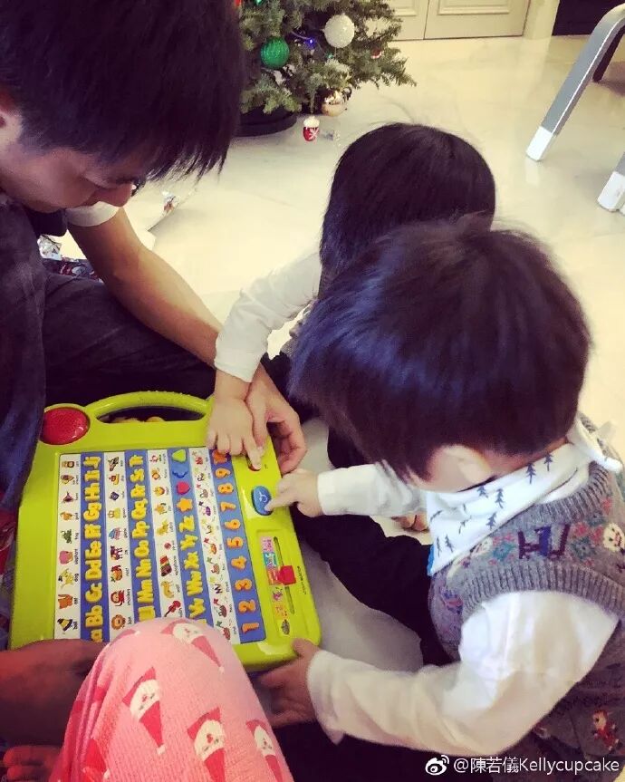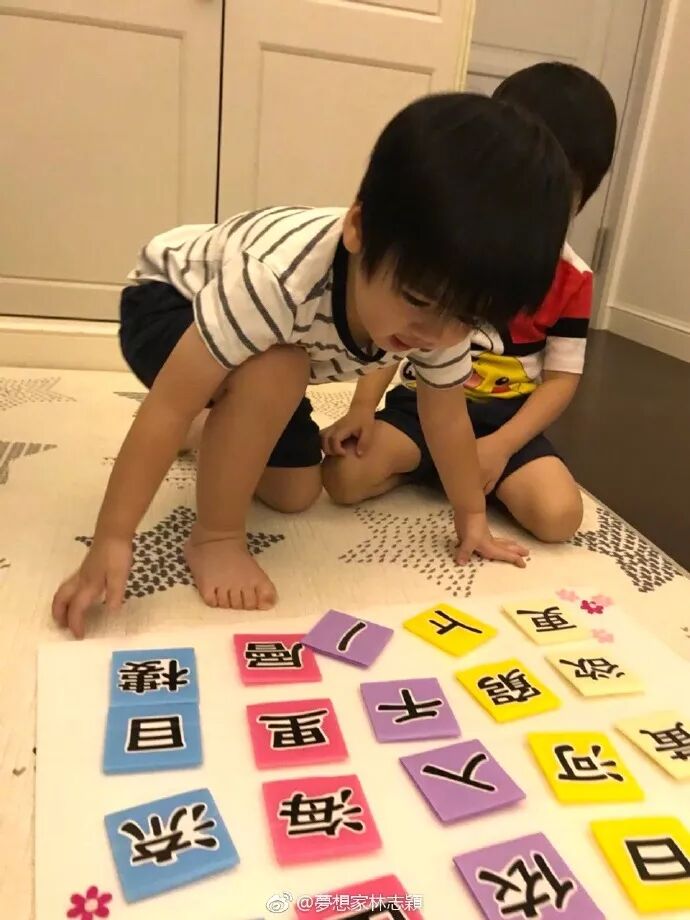 林志颖给家里准备了好多童书和启发思维的玩具,一有空他们就铺开来玩,也教娃学习写字。