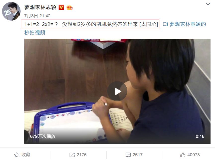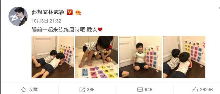 国庆假期不好好出去度假,大晚上还带着双胞胎儿子学习,林志颖一家也够刻苦努力的。他发博说儿子睡前在练习古诗。