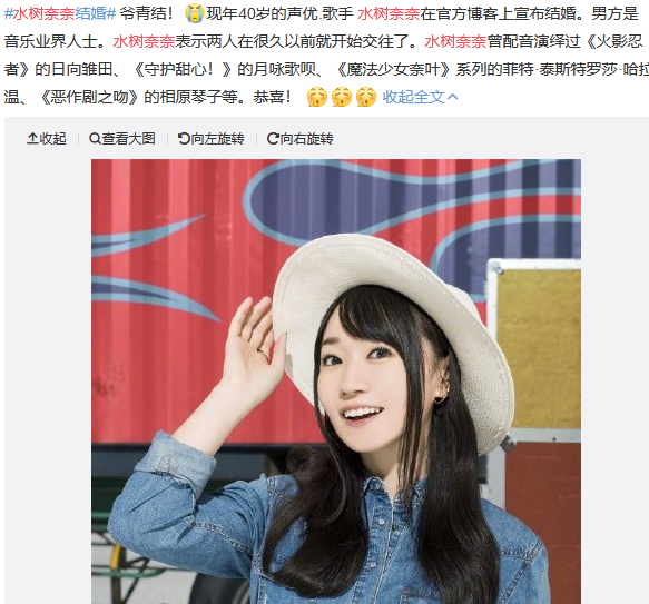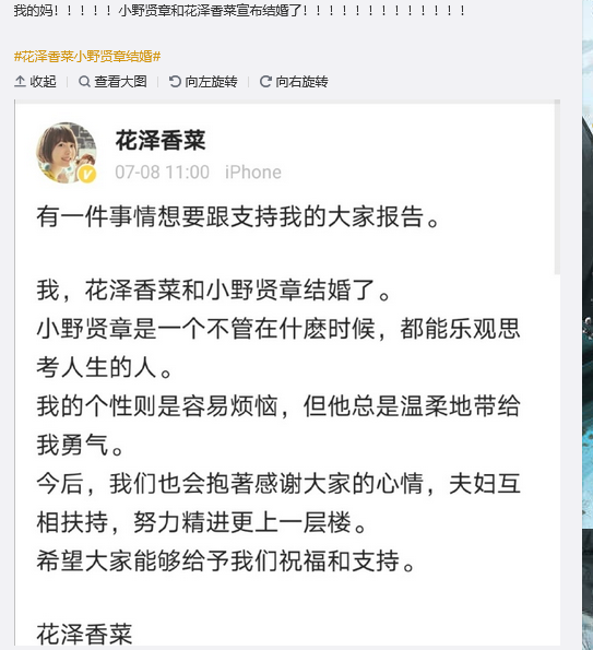 花泽香菜也在微博上用中文告诉了粉丝这个消息