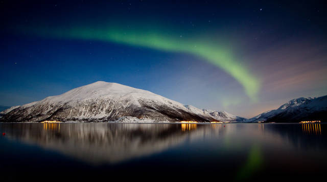 这里有雪景与极光的绝美搭配,彩色的小屋,极光,极夜,梦境中的绚丽场景,在这里都炙手可得。站在宽广的冰川雪山下,无云的夜空,淡绿色和浅玫瑰色的光幕飞舞,漫天的繁星映衬着白雪,让人迷醉。