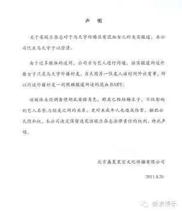 仅有的一次还是11年的时候,同样也是被传有“私生子”当时爆料说马天宇已和一位外籍女子秘密结婚,且育有一位混血女儿