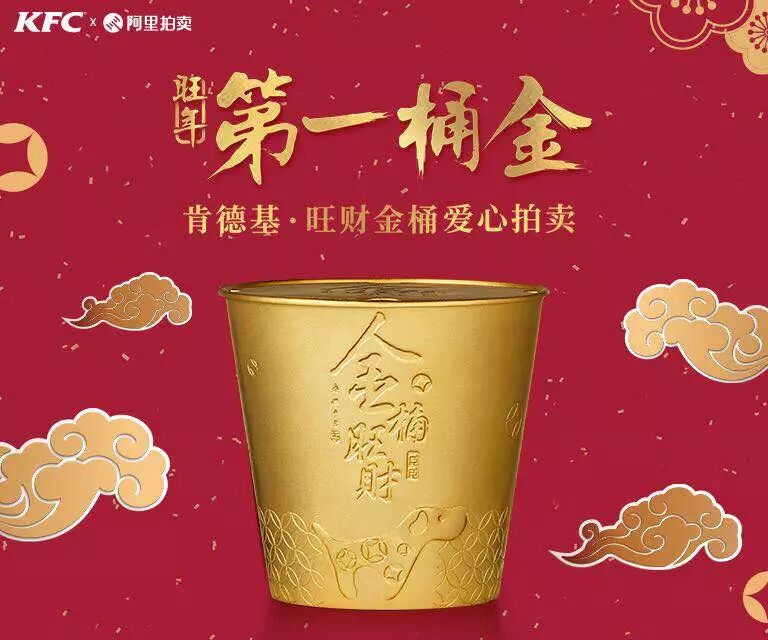 自2月8日起肯德基将联合阿里拍卖在门店举办“旺年第一桶金—旺财金桶爱心拍卖”活动。