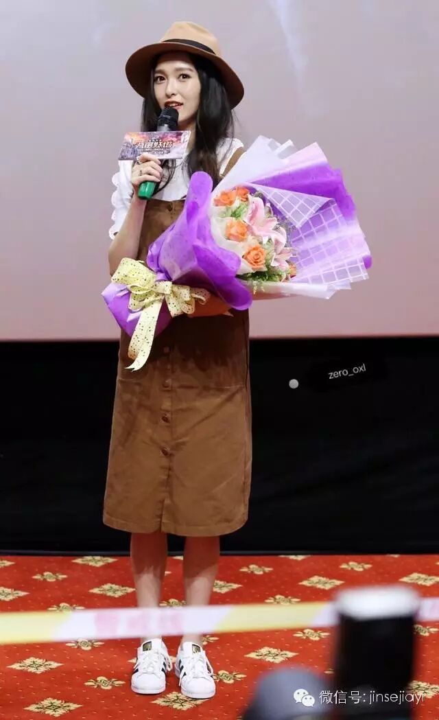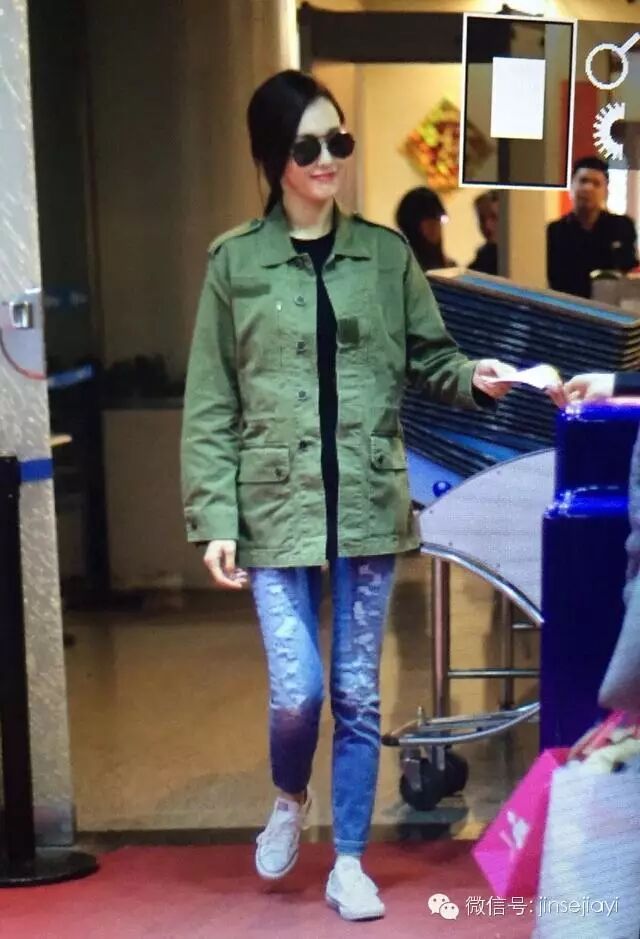 不只是我们追剧,明星也追呢!看糖糖在穿这身军装夹克,肯定是被太阳的后裔影响了,下搭牛仔裤,很简单却时尚, 利落的马尾与帆布鞋搭配,很减龄学院风。