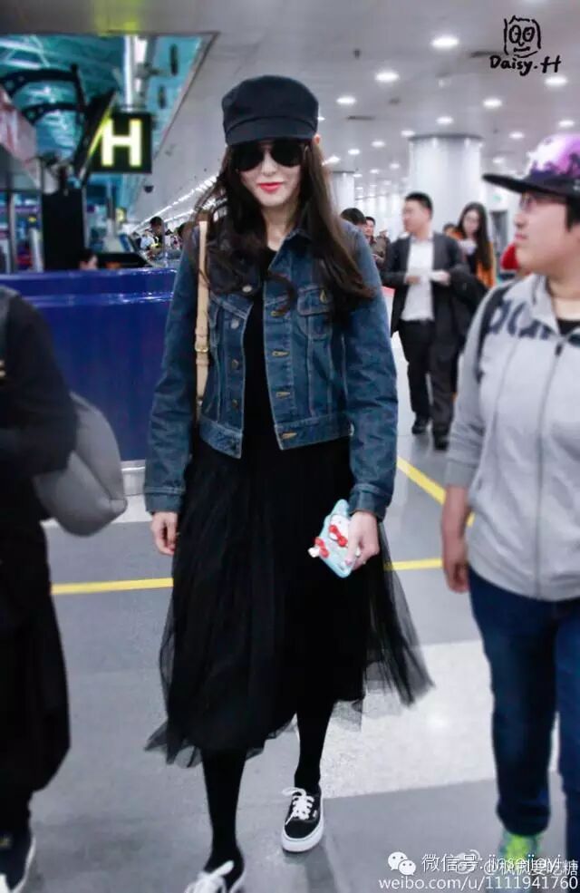 唐嫣真的很爱穿黑色装,网衫裙子也要穿黑色,外搭牛仔外套,穿丝袜搭黑色休闲鞋,很随性又时尚的搭配。