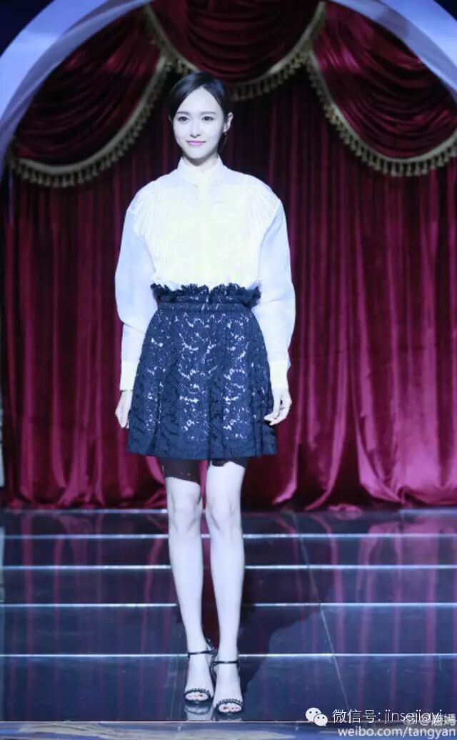 唐嫣颜值高,腿细长直,穿泡泡袖的白色上衣短款搭配蓝色包裙,十分甜美性感, 一双白色高跟鞋,很有女人味。
