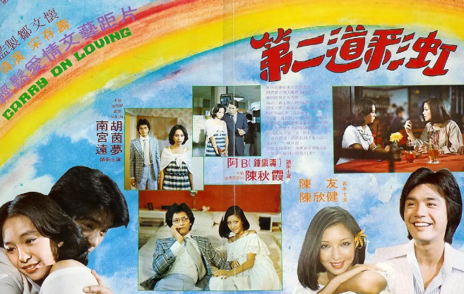 阿B单飞的第一部电影,还是宋存寿大导演的作品《第二道彩虹》,两位女主角都不得了,一位是台湾的胡因梦,一位是香港的陈秋霞。男二号则是温拿中的陈友。