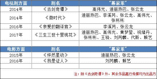 据不完全统计,自2014年起,高伟光、迪丽热巴、张云龙、李溪芮、张彬彬等人就开始频繁出现在杨幂出演的影视作品里。而这些作品都有一个共同特点:嘉行传媒出品。