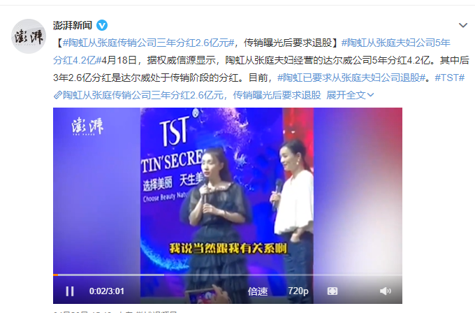 入股5年,光是分红,陶虹就赚了4.2亿,这其中有2.6亿的分红,是公司处于传销阶段里所得的。