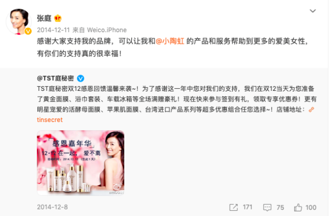 为了帮张庭做推广,陶虹经常在微博里为张庭的产品做推广。