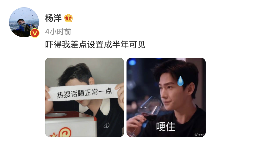 于是突然被挂上热搜的杨洋本尊出面回应:“吓得我差点设置成半年可见。”