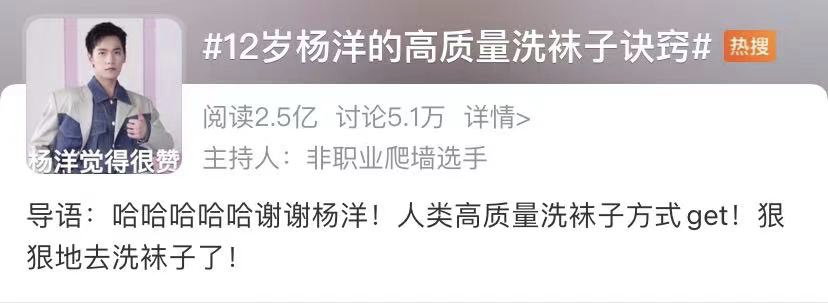 有网友扒出了年少的杨洋认真洗袜子的考古视频,这项技能后来还被杨洋带到了《天天向上》的节目现场。
