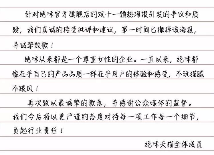 随后,绝味天猫旗舰店下架了这幅海报,并于官方微博发布了一则道歉声明:
