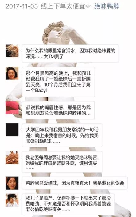 以下是最近的一条推送,在著名裸男大卫的背景上,绝味的胖友们又开始飙车了: