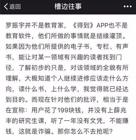对于此事,和菜头也在公众号“槽边往事”中发表了看法。作为《得到》APP的专栏作家,他认为,知识付费的出现,是因为供求双方都存在,而罗振宇做的也只是带大家入门而已。