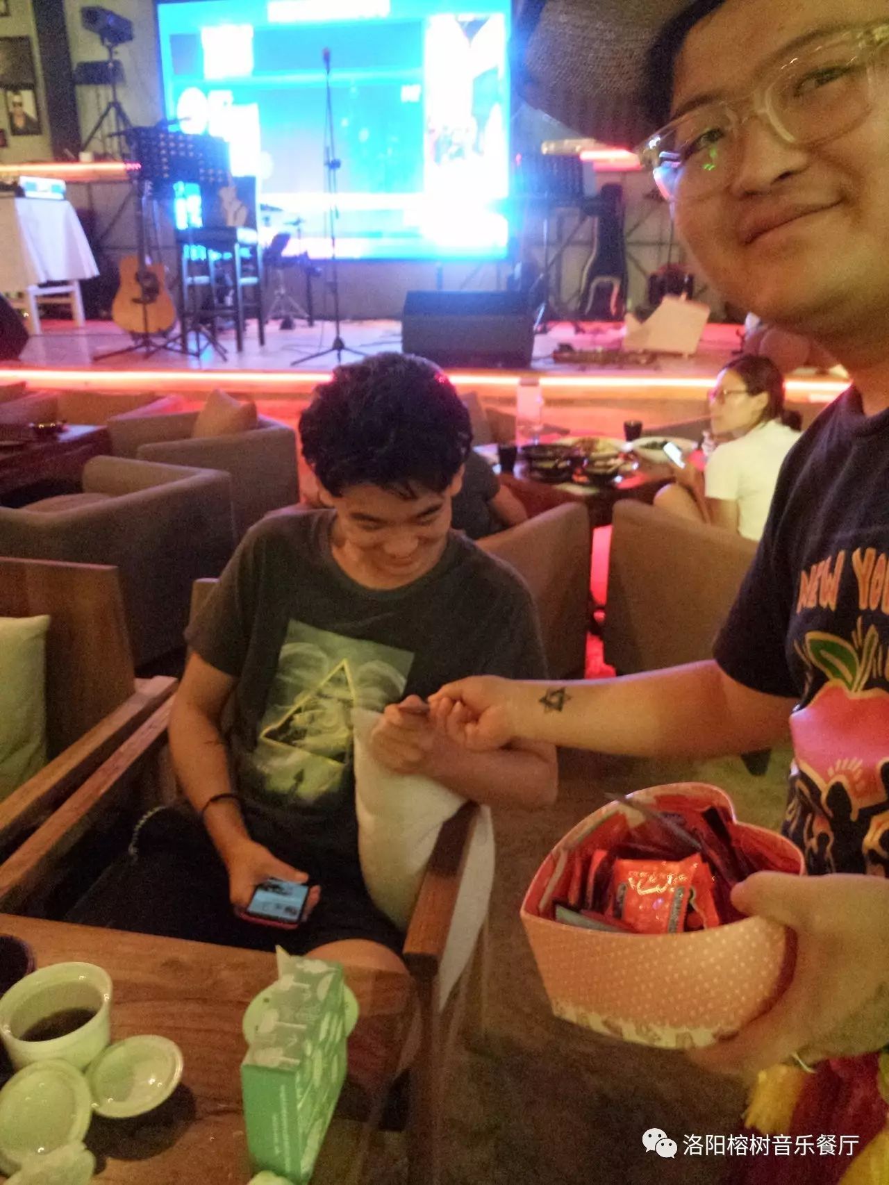 最后的冠军获得了由榕树音乐餐厅赠送的法国鹰标红酒一支、亚军获得了百威啤酒一打、冠军还赠送了一份神秘大奖、来看看是什么?