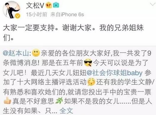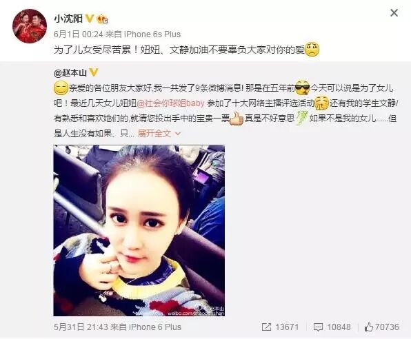 这几年赵本山虽然退居幕后,但也不忘尽力为女儿宣传。比如当女儿告诉自己“我在做直播,需要宣传”后,很少发微博的他还特意发了条微博,为了女儿竞争网络十大主播拉票。