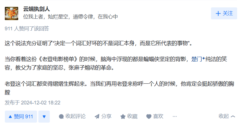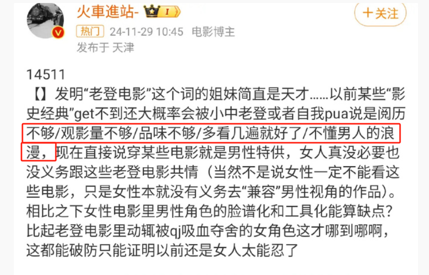 “老登电影”源自一个对抗的概念,用来反抗大环境对于女性创作的歧视,的确有一定的讨论价值。从今天的性别观念重新审视过去的影史经典,也是一种新的观看视角。然而随着讨论的逐渐发酵,“鉴登”就成了直接在性别上进行提纯,从而在一些全民认可的高口碑电影作品中进行审判的活动。
