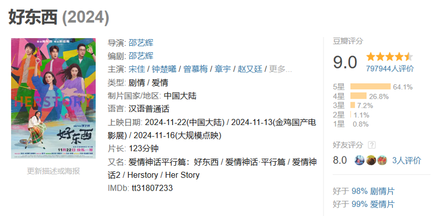 由于这些女性视角和女性感官经验世界的敞开,舒服也成为了许多女性观众对《好东西》留下的观后体验,跨年档中作品累计票房7.2亿,豆瓣近80万人参与打出9.0的高分。