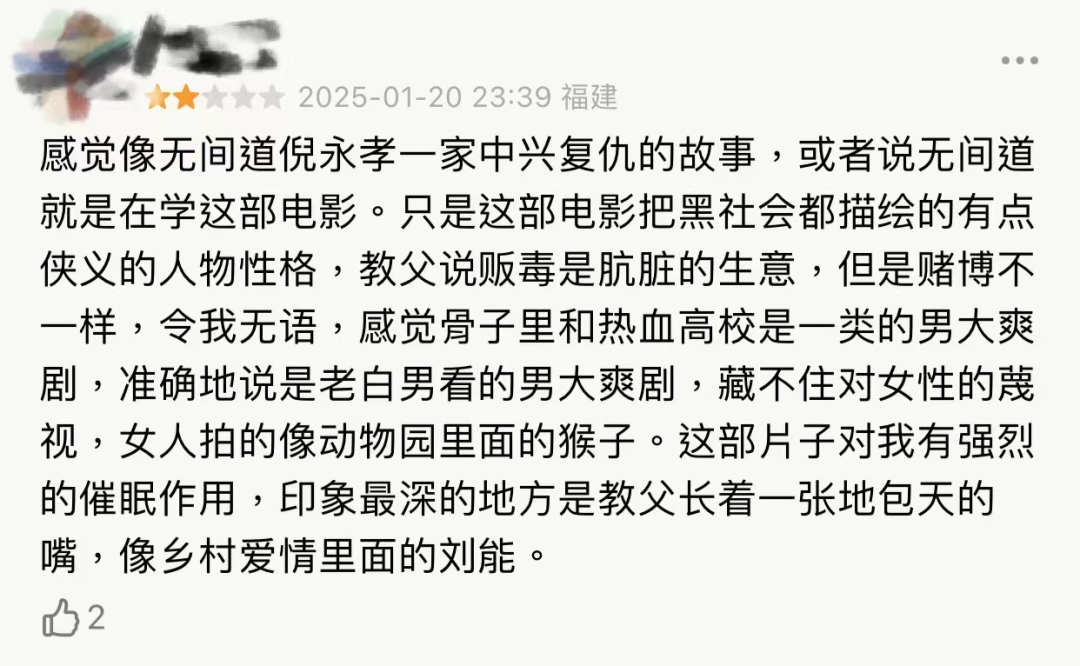 很难想象,一部展现黑帮家族对财富、权利、地位的追逐,身陷罪恶之中无法自拔,揭示出现实生存悲剧性的划时代作品,是专供老登厌女白男的大爽剧。