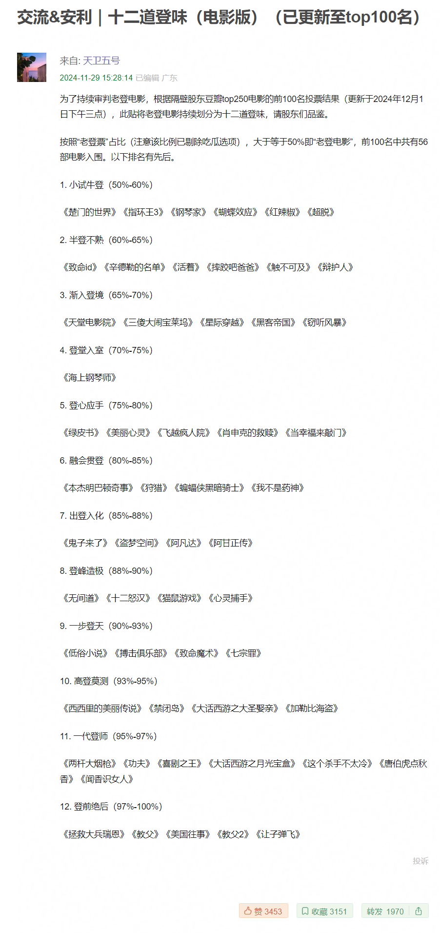从豆瓣电影TOP250到有头有脸的中外男性导演,多数被冠上“老登”的标签,借以代指一切“含男量”过高或具有浓厚男性气质的男本位电影。而“含登量”一词,则成为“老登电影”的评判标尺。一部电影是否“老登”,“登级”如何,由网友参与票选,从小试牛登(50%-60%)到登前绝后(97%-100%),基本涵盖了大家耳熟能详的经典作品。