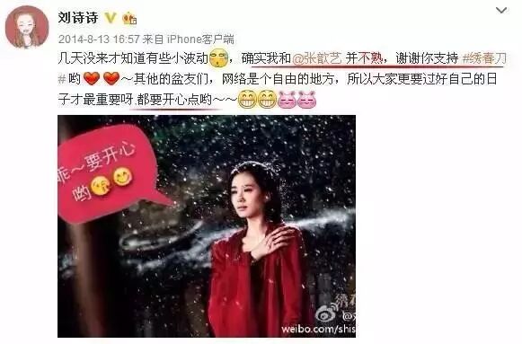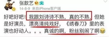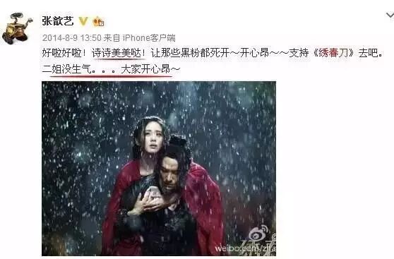 两年前,张歆艺发了一条赞美绣春刀刘诗诗以外所有人的微博。据说,也是有人在评论里提意见了,为啥独缺了刘诗诗。于是张歆艺连发了两条微博解释。小编隔着屏幕都感觉尴尬!
