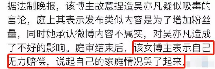 而原告吴亦凡方也明确了赔偿经济损失、精神损害抚慰金以及合理支出的依据,并且要求被告王某某赔偿55万元的损失费,但是被告王某某却称吴亦凡方索赔过高,自已无力承担,对此,网友纷纷表示称:家庭条件差,就可以造谣别人,不用赔钱吗?更纷纷表示支持吴亦凡维权。