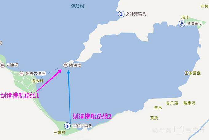 泸沽湖景区内,因为全岛、半岛多,所以码头也多。各个码头都有猪槽船可坐,有手划、电动的区别,一般是船夫掌舵。