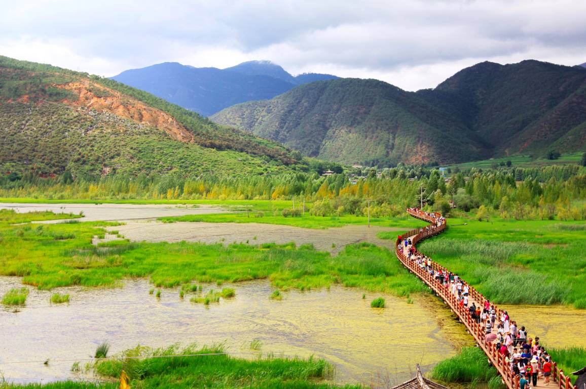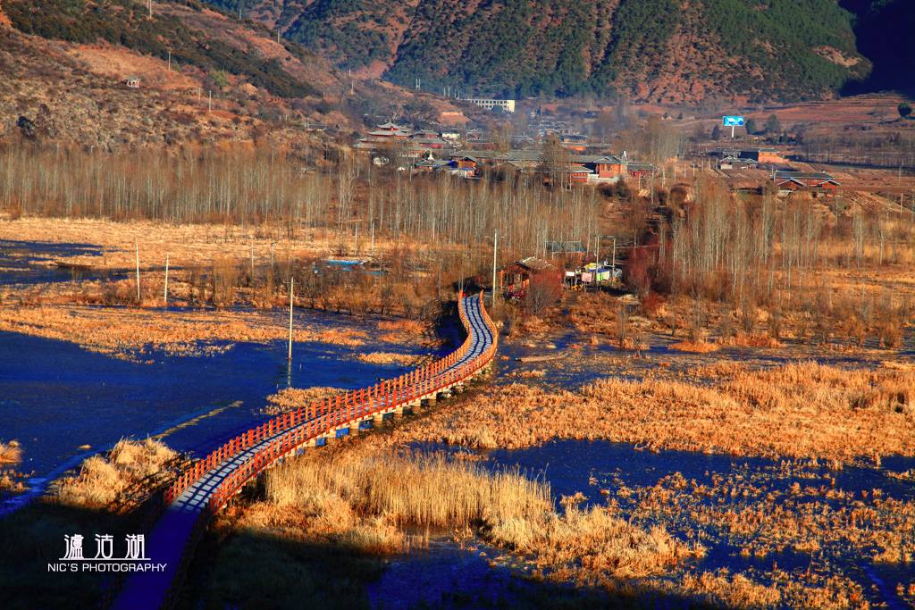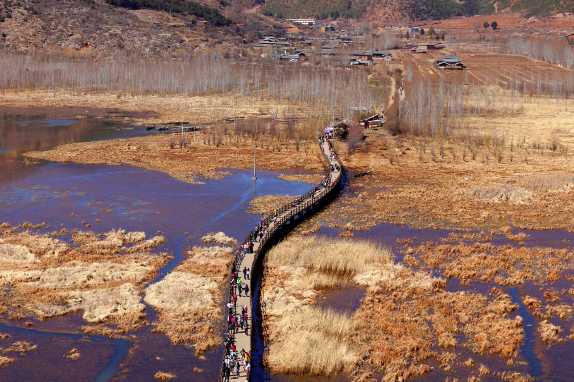 走婚桥横跨草海,穿过芦丛,直达两岸村落,为两岸村民、“走婚”的“阿夏”们提供了便捷的通道。历史上,走婚桥还是左所土司喇宝臣的汉族夫人去后宫的一条捷径。