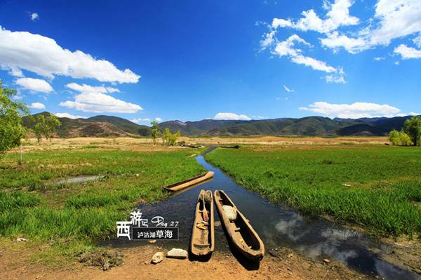 15000亩草海,是镶嵌在泸沽湖东面的翡翠,草海内芦苇如墙,水路错综,红白衣裙的摩梭姑娘划着猪槽船出没其中,悠扬的“啊哈吧啦”民歌在水草丛中回荡。