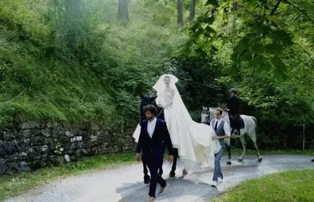 这对有着共同气质的情侣牵手两年后终于走向了婚礼,婚礼地点是瑞士的Tarasp城堡,有着近千年的历史,是瑞士为数不多的中世纪古堡。它虽然不华丽却朴素而庄严。身着婚纱,骑着黑马,在中世纪的千年古堡中宣誓,罂粟花映衬着祖母绿satin鱼尾立体斜裁的Second Dress,华丽魅惑。这何尝不是许多姑娘梦寐以求的婚礼和人生,而晚晚将梦变成了现实。