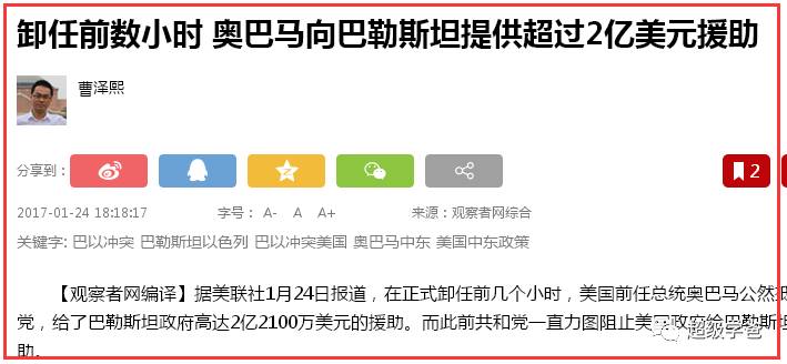 不仅如此,奥巴马在下台前几个小时,还批准了两个多亿美元的支援以色列的死对头巴勒斯坦。