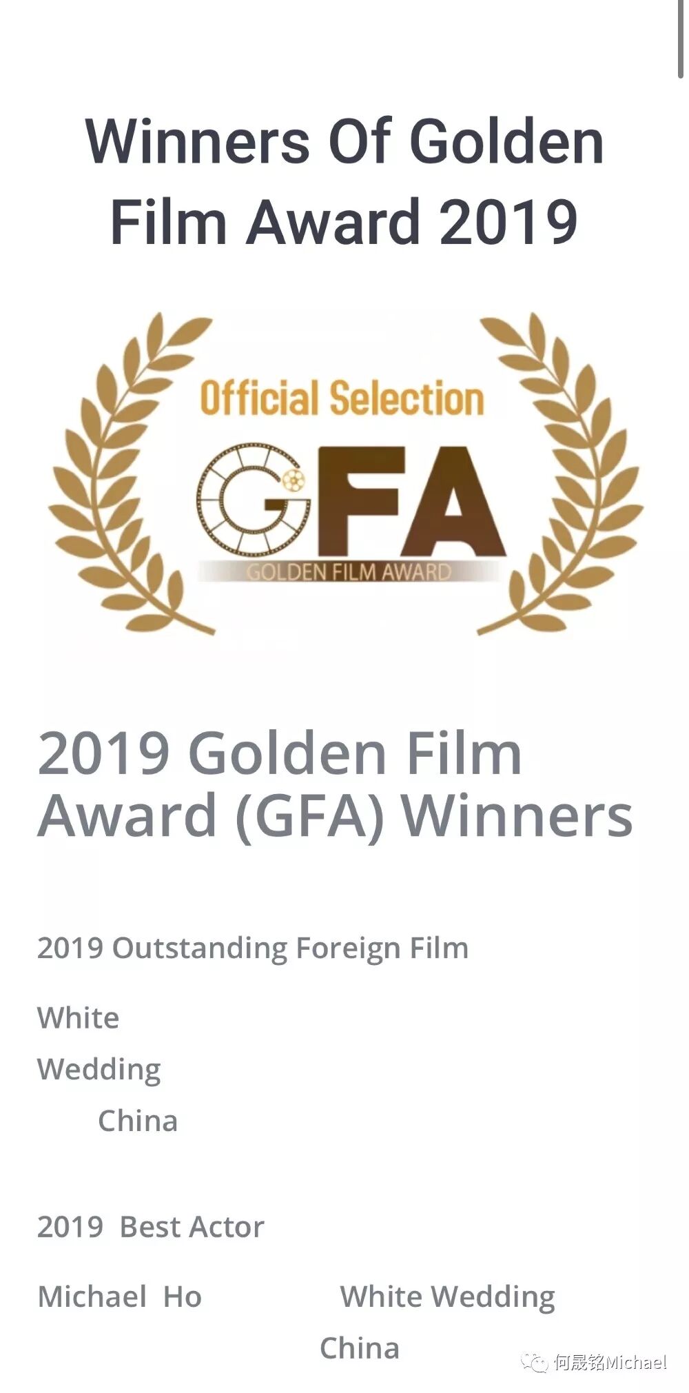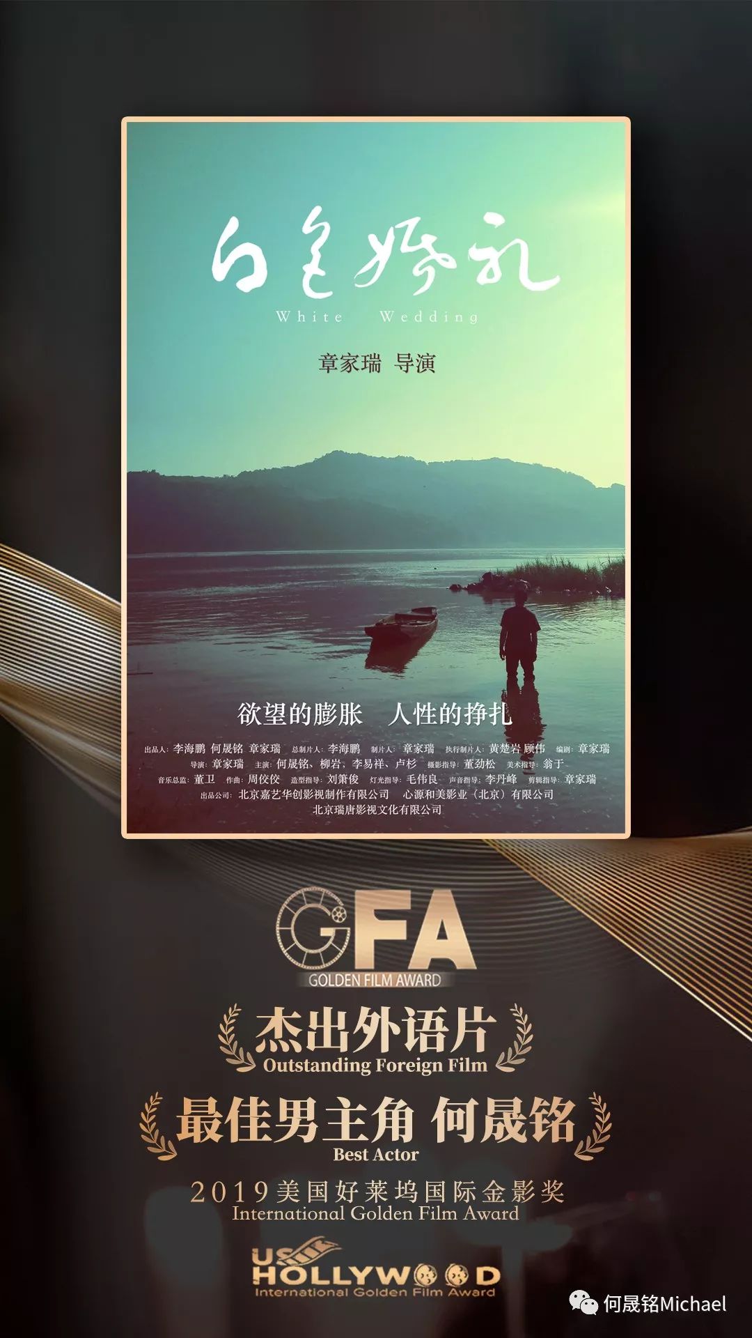 美国洛杉矶当地时间12月13日,2019美国好莱坞国际电影节金影奖GFA(Hollywood International Golden Film Award)上,由第六代导演章家瑞编剧执导,何晟铭、柳岩、李易祥、卢杉主演的电影《白色婚礼》一举拿下杰出外语片(Outstanding Foreign Film),主演何晟铭更是凭借“二山”一角摘得本届金影奖最佳男主角(Best Actor)桂冠!
