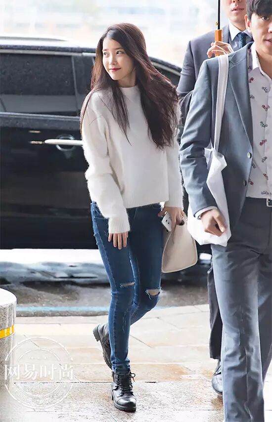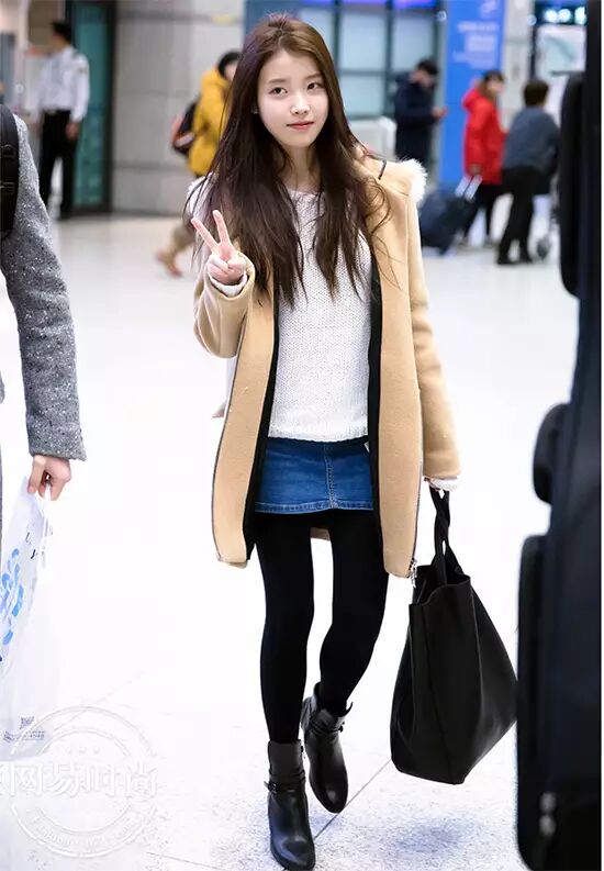 IU穿牛仔半裙+黑色保暖袜+黑色短靴。▼