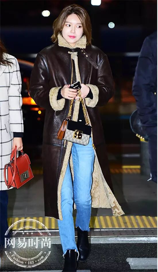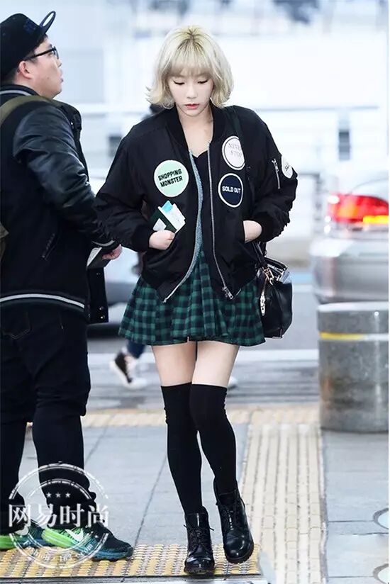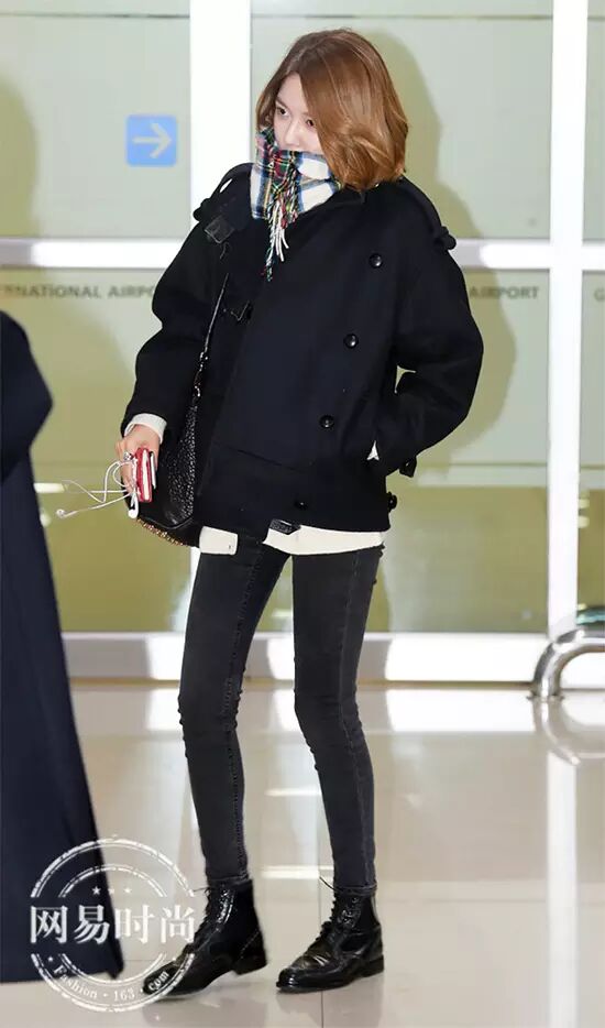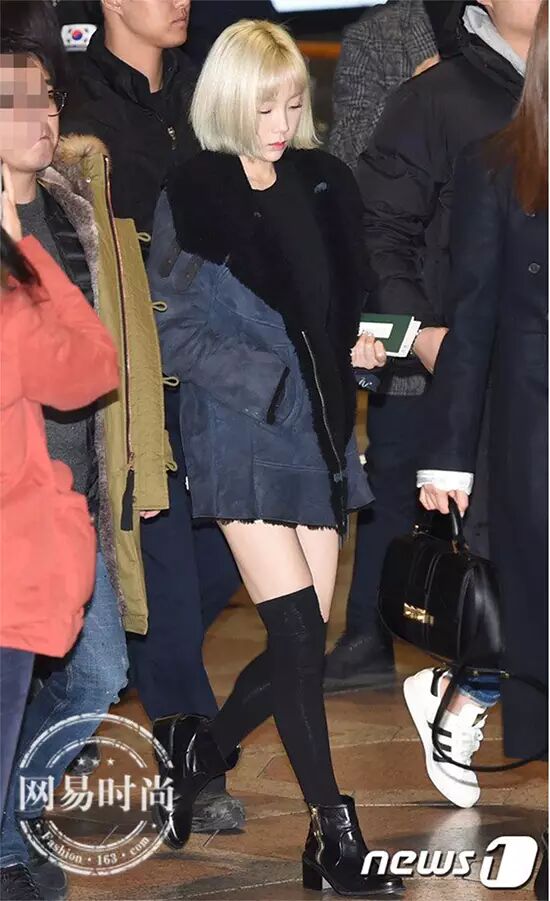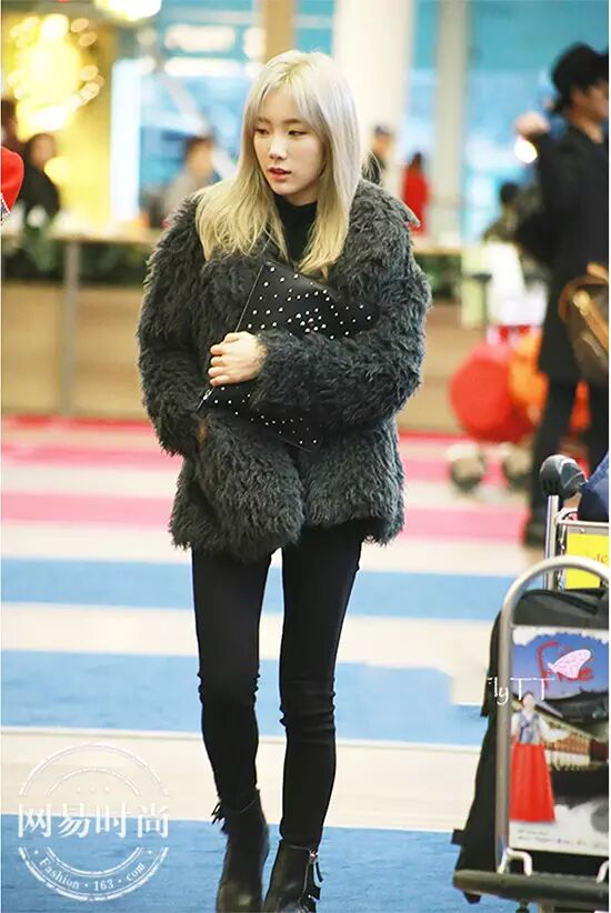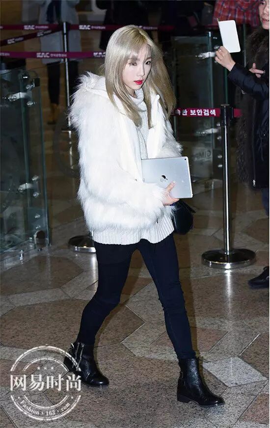 泰妍用软软萌萌的外套搭配黑色短靴,炒鸡可爱。▼