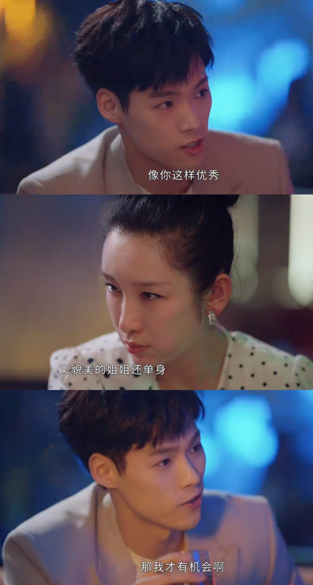 老实说,董又霖的出场太像专门吊富婆的鲜肉了,他搭讪的台词超级油腻:“像你这样优秀又貌美的姐姐还单身,那我才有机会啊”。不过他不是在酒吧工作的,而是个超级富二代,结合后面的剧情来看他接近秦海璐似乎是真心的。