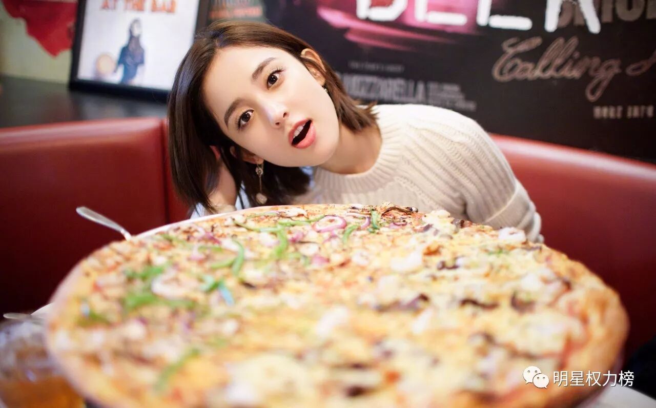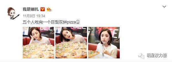 昨天娜扎在微博上PO了一张巨大披萨的自拍,配字:五个人吃完一个巨型双拼pizza。