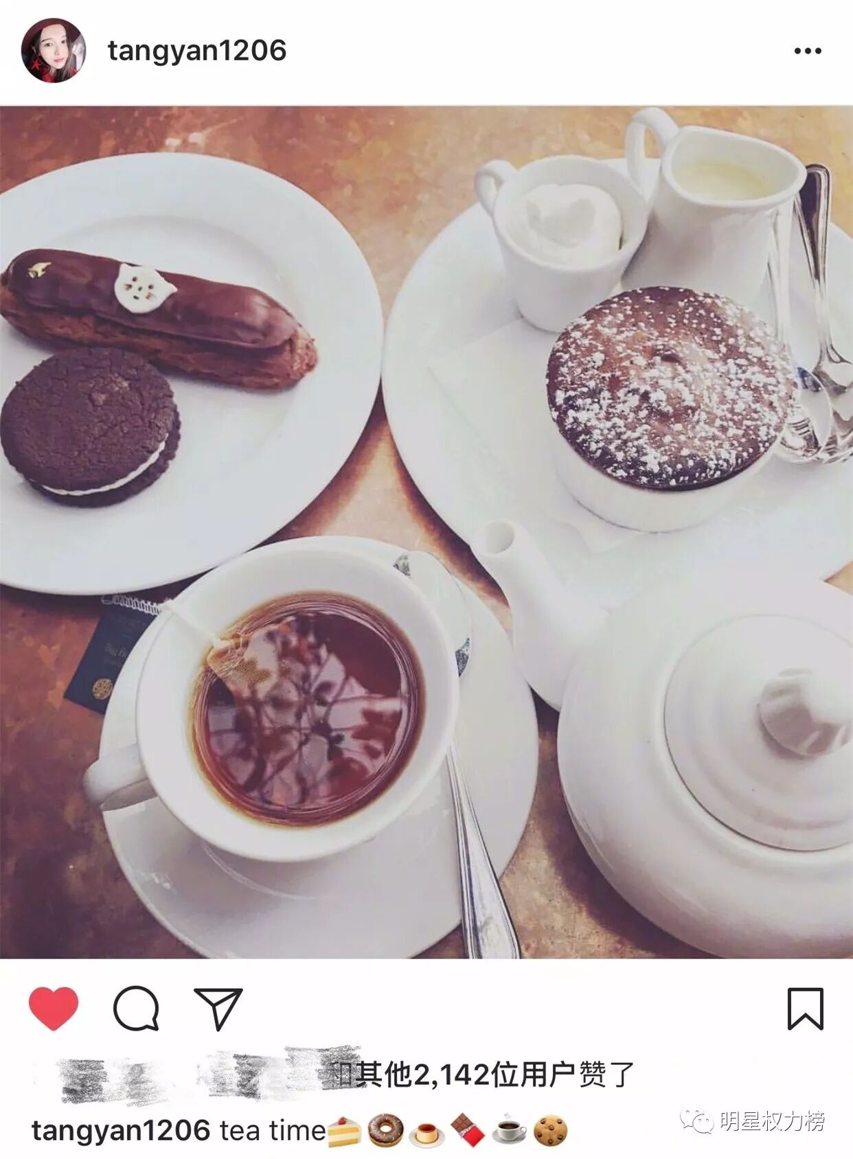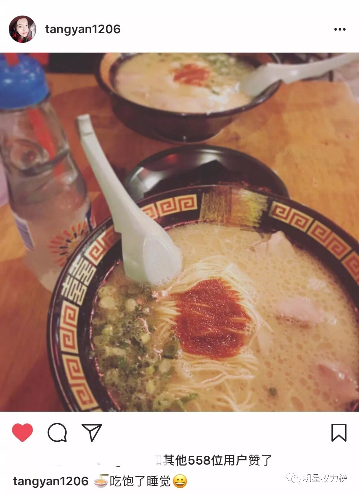 像唐嫣在INS上就俨然变成了一个美食博主,经常深夜放毒,全是美食。