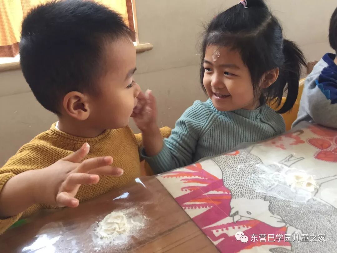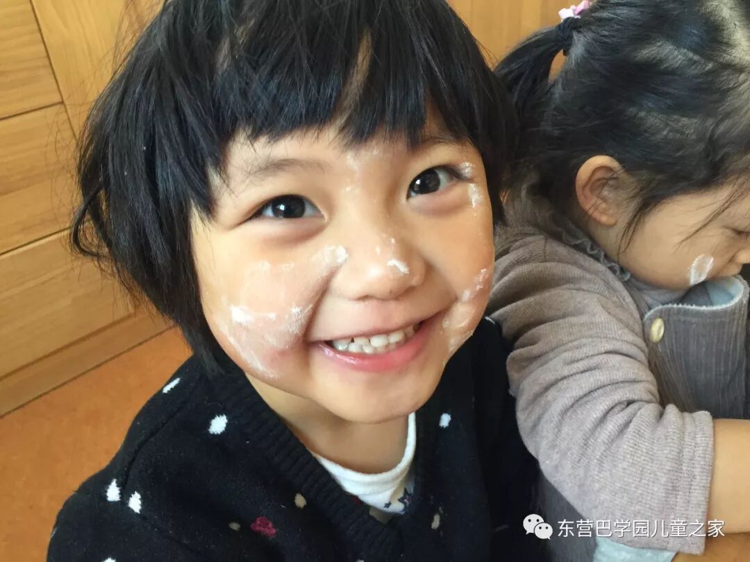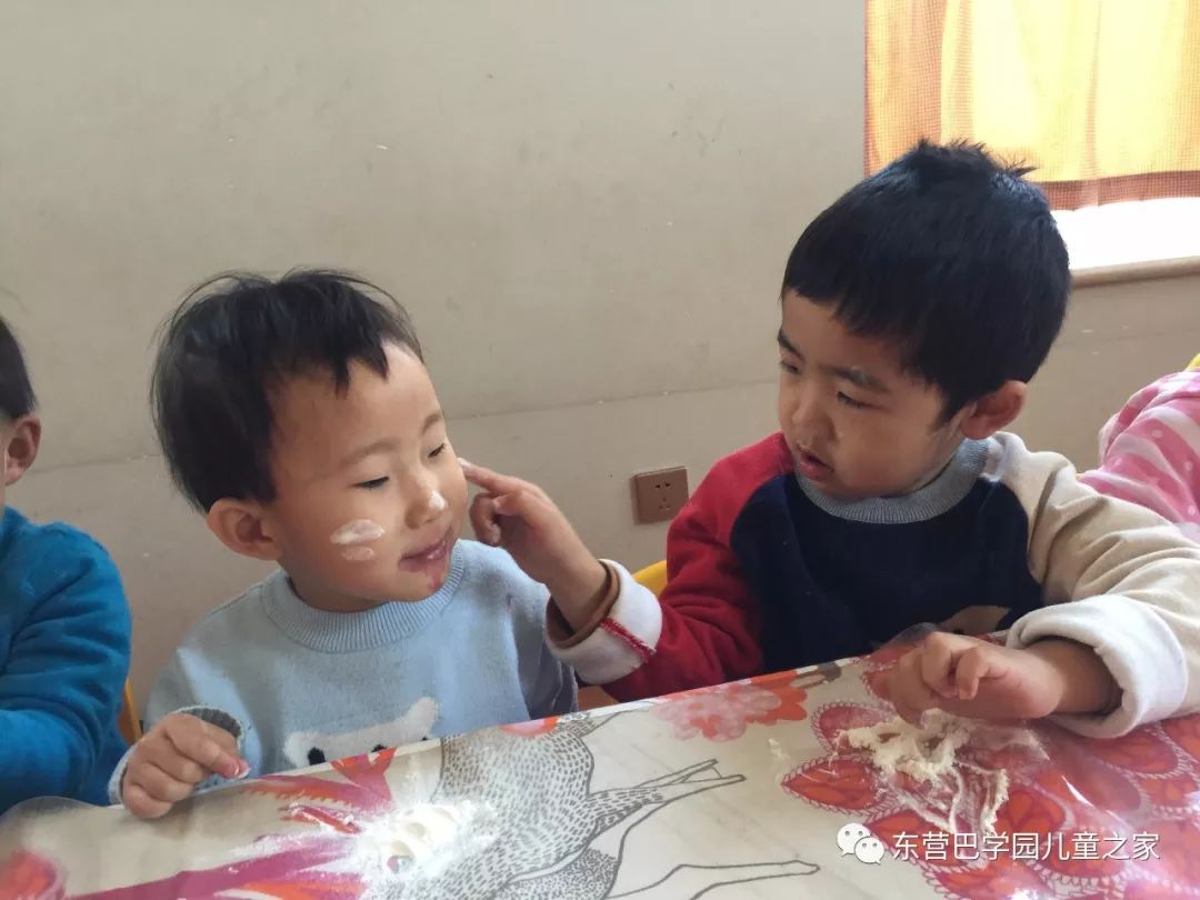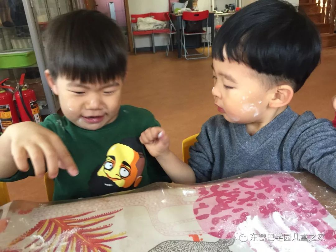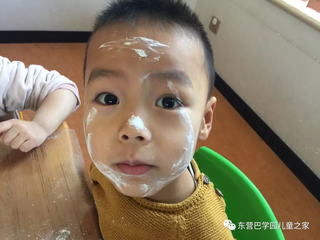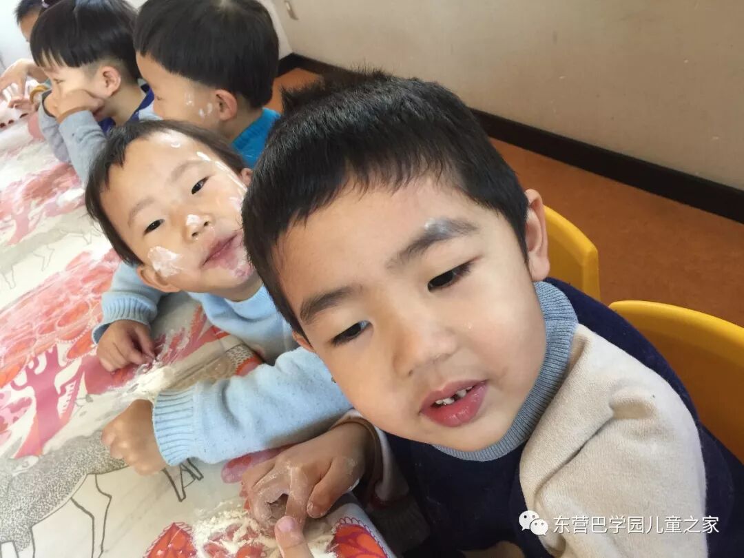 做花馍馍之前,玩面粉自然少不了!几个小朋友一起你抹抹我我抹抹你,一会就变成了一个个小花猫!不仅自己变成小花猫,看着同伴们也变成小花猫,笑的更是前仰后合.
