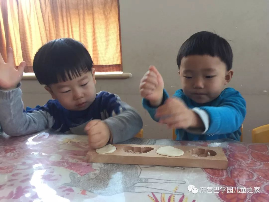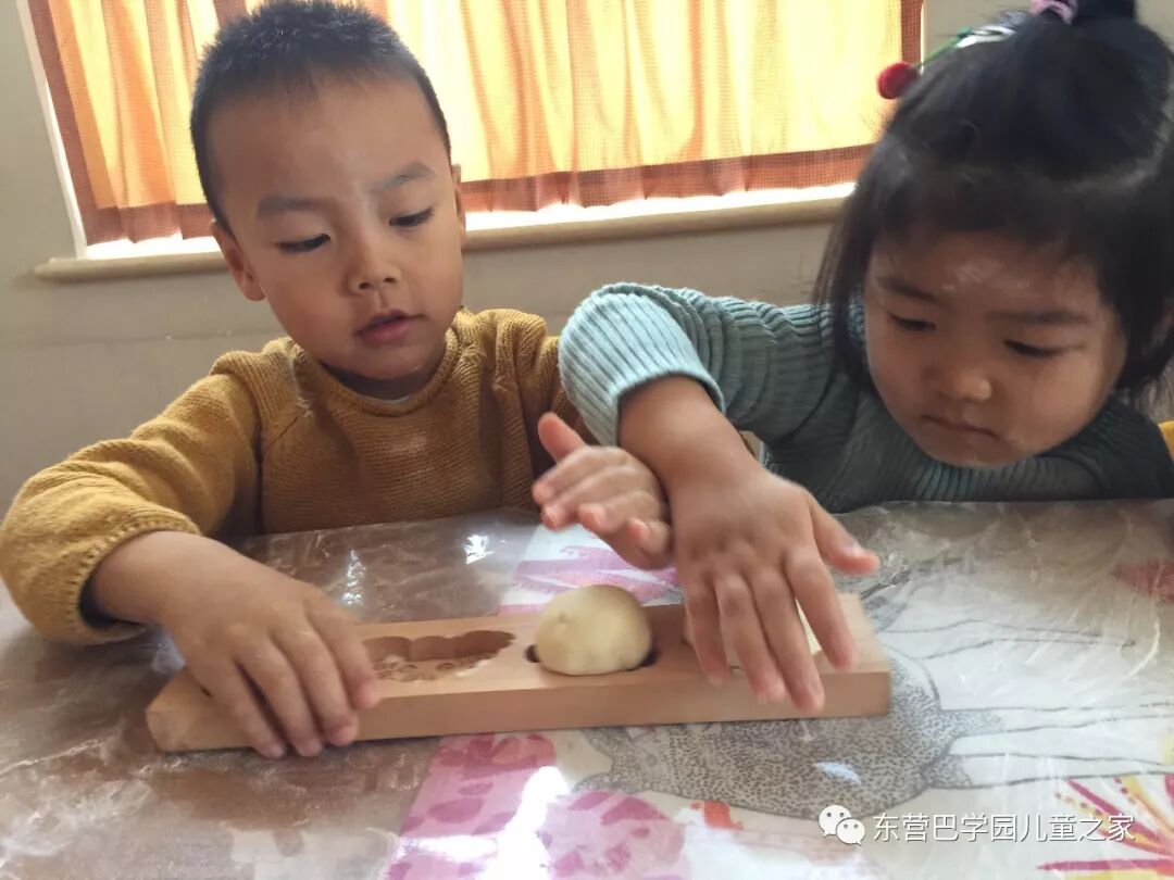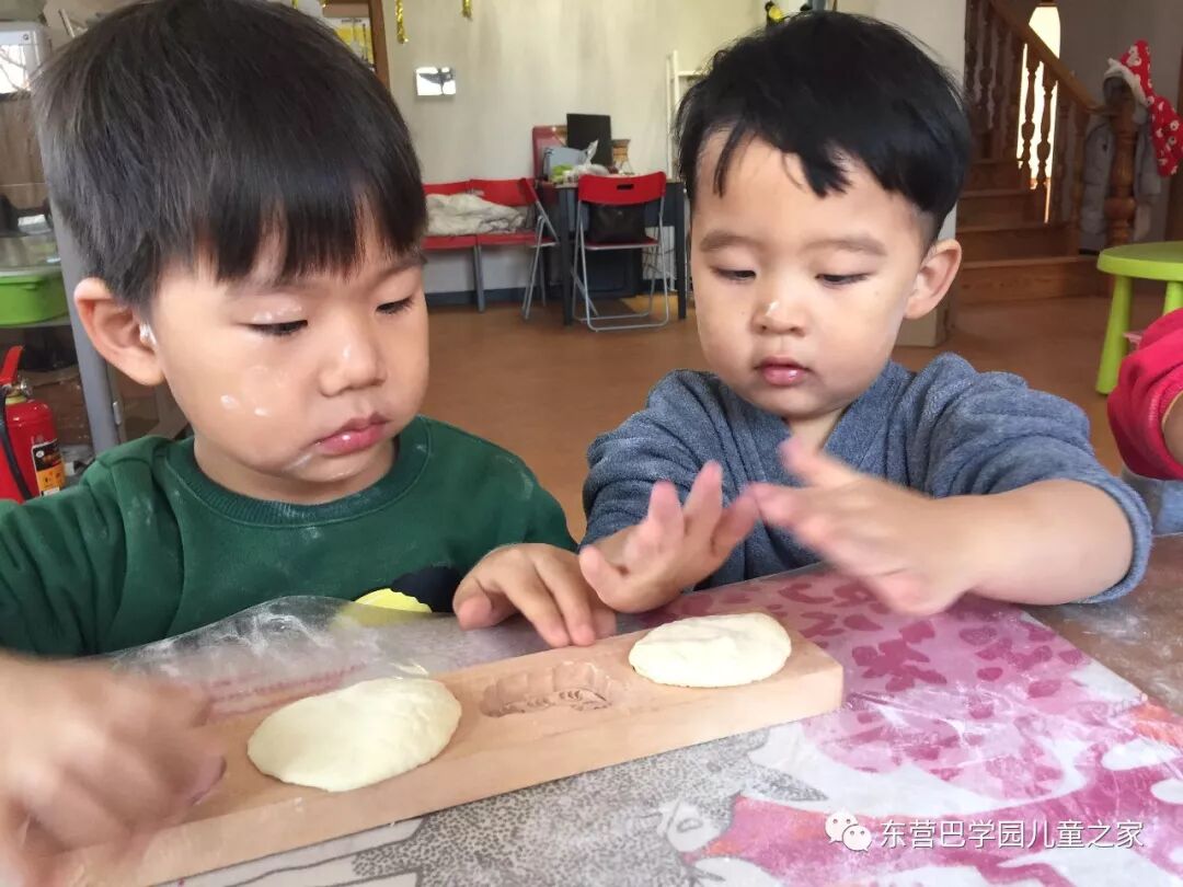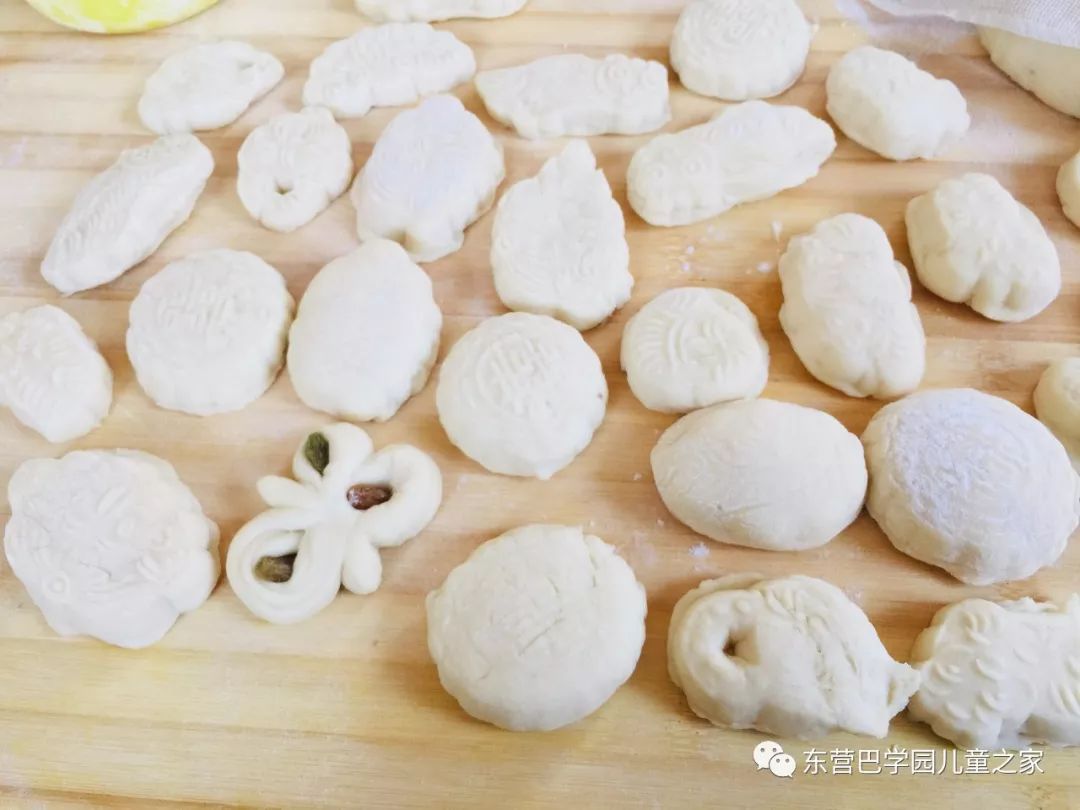 哇!好漂亮啊!看着一个个模具,孩子们兴奋的摸一摸,看一看,小面团放在里面,小手按一按,磕一磕,一个自己制作的花馍馍就完成啦!为了图案的更加完美,孩子们可是费了不少劲,想了各种各样的方法,有的使劲按,有的把面团搓的小一点,有的按照模具的形状修改面团。为了制作一个美丽的花馍馍,孩子们可是动了不少心思。