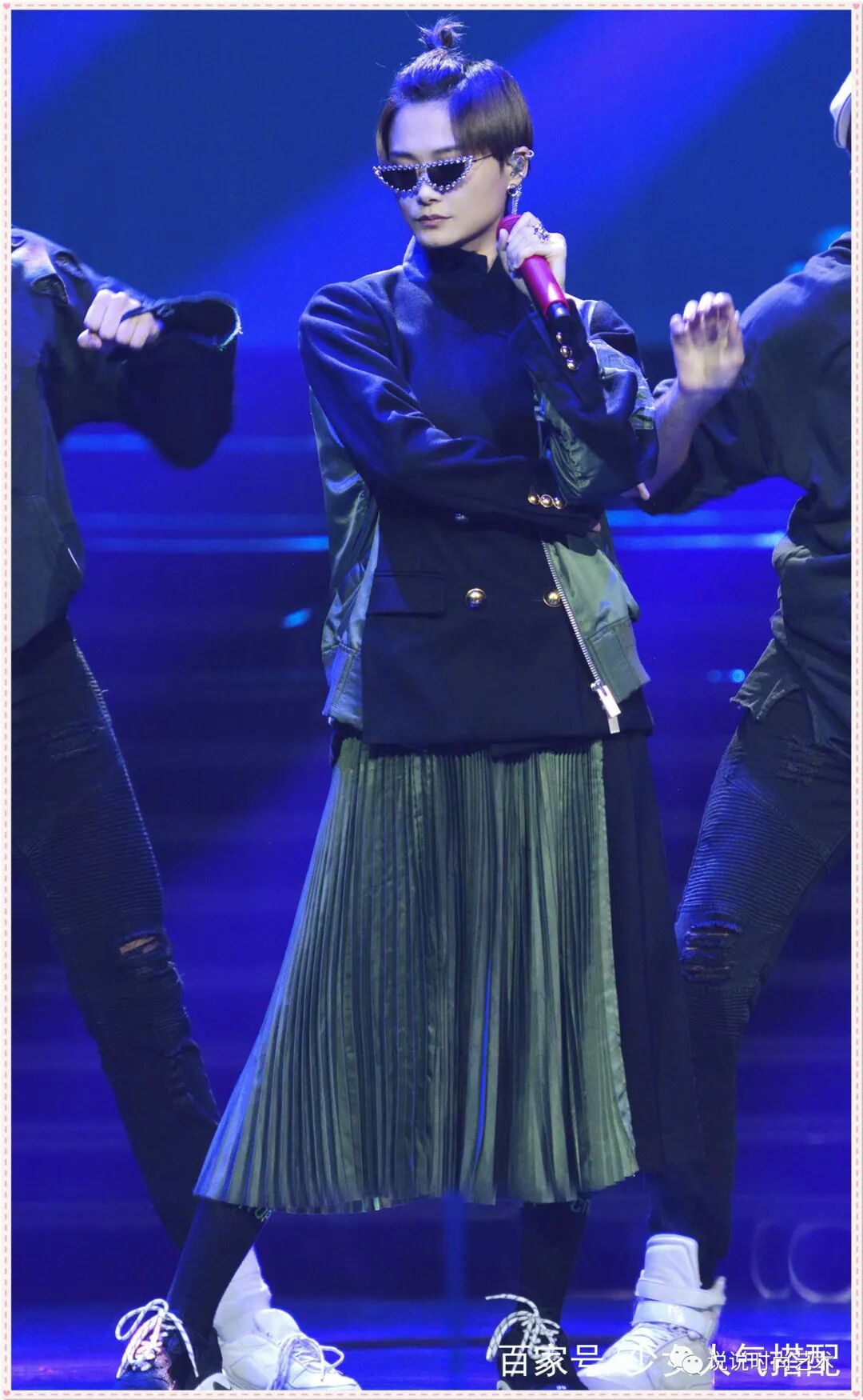 现在李宇春发展的是越来越好,不仅是在唱歌方面,更是发展到影视方面,而且她现在的造型也越来越多变,虽然还是之前短发的形象但是也开始尝试穿裙子了,她身穿一件黑绿拼接的外套,侧边设计和纽扣的设计都非常的时尚,下身搭配一条同系列的裙子,非常的个性。搭配一副镶钻的眼睛非常的摩登范儿,扎起来的小啾啾也非常的可爱。