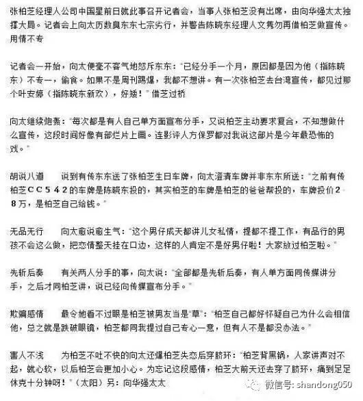 分手后,陈晓东谈起旧爱张柏芝,竟然揭露了她很多不为人知的事,大大影响了张柏芝的形象,这一行为大大惹怒了向太,要知道那时张柏芝可是向太公司热捧的女星,随后向太陈岚召开记者会历数陈晓东七宗罪:用情不专,借芝过桥,胡说八道,无品无行,先斩后奏,欺骗感情,害人不浅。